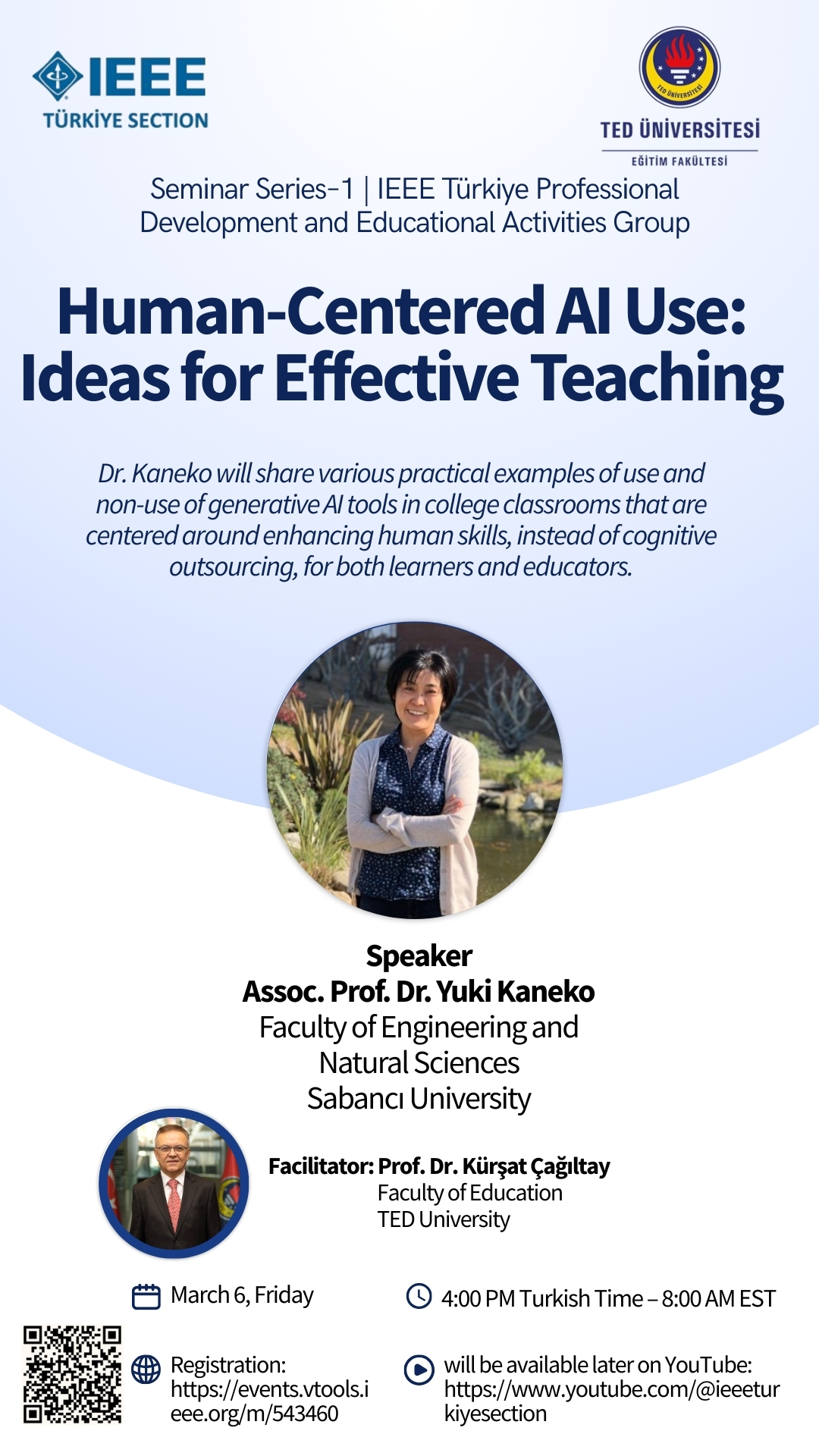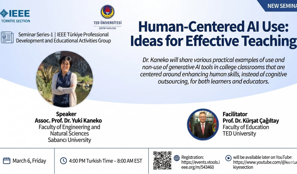 In this seminar of IEEE Türkiye Professional Development and Educational Activities Group, Dr. Yuki Kaneko will share various practical examples of use and non-use of generative AI tools in college classrooms that are centered around enhancing human skills, instead of outsourcing for both learners and educators.
